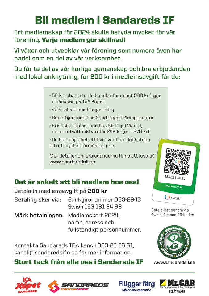 Bli medlem i Sandareds IF Ert medlemskap för 2024 betyder mycket för vår förening, varje medlem gör skillnad! Vi växer och utvecklar vår förening som har både fotboll och padel i vår verksamhet. Du får ta del av vår härliga gemenskap och bra erbjudanden med lokal anknytning Det är enkelt att bli medlem hos oss! Betala in medlemsavgift 200 kronor Betalning sker via: Bankgironummer 683-2943 Swishnummer 123 181 34 68 Märk betalningen: Medlemskort 2024, namn, adress och fullständigt personnummer. Kontakta Sandareds IF:s kansli 033-25 56 61, kansli@sandaredsif.o.se för mer information. Sandareds IF 19 jan 2024 0kommentarer