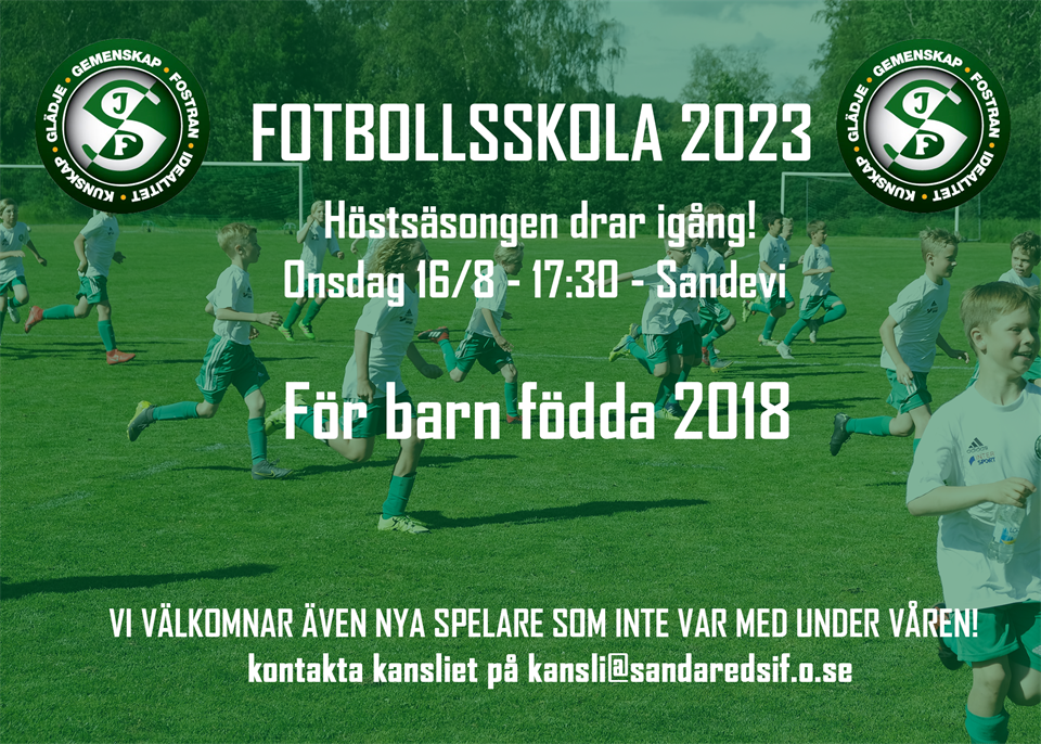 Onsdagen den 16/8 drar träningarna igång igen för Fotbollsskolan (barn födda 2018). Det blir träning varje onsdag fram t.o.m 4/10. Nya spelare välkomnas! Kontakta kansliet på kansli@sandaredsif.o.se vid intresse! Nu ser vi fram emot en trevlig höst på Sandevi! //Anton Wall Klubbchef, Sandareds IF Sandareds IF 9 aug 2023 0kommentarer
