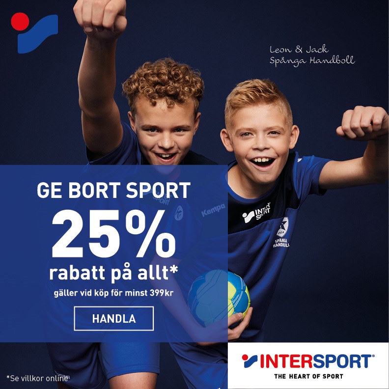 Hej på er! Julen har kickat igång ordentligt hos vår samarbetspartner Intersport! Mängder av julklappstips och allt ni behöver för en aktiv vinter. Genom Intersport kan du ge bort sport och stötta föreningslivet. Då kan fler barn idrotta och ha kul tillsammans. Att se barn och ungdomar som idrottar och har roligt tillsammans gör oss alla varma i hjärtat. På allt du handlar hos Intersport ger de 3% tillbaka. En klapp från dig blir en klapp till föreningslivet. Just nu får du dessutom 25% rabatt på allt*, som en extra julklapp. När du handlar på Intersport ger de 3% av alla köp tillbaka till just er förening, för du har väl valt förening att stötta extra på ”Mina sidor”? Så, ge bort sport och hjälp oss att stötta föreningslivet. God jul och stort tack! Läs mer i bifogad fil och återkom om ni har frågor eller funderingar! https://www.intersport.se/kampanj/jul