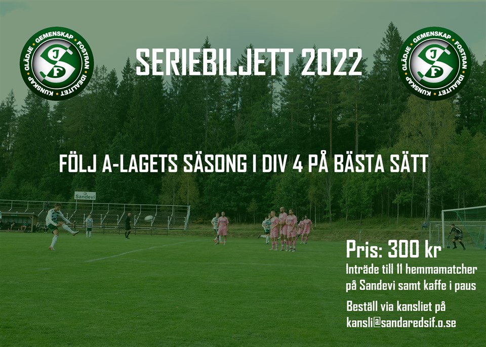 Vill du uppleva A-lagets säsong på bästa sätt? Då passar seriebiljetten perfekt för dig! Från och med idag går det bra att beställa seriebiljetter till A-lagets samtliga 11 hemmamatcher i division 4 under året. Biljetterna kostar 300 kr och då ingår entré till de 11 matcherna samt kaffe i pausen. Ordninarie entrépriser i Division 4 under 2022: Entré vuxen: 50 kr Entré pensionär: 30 kr Under 16 år: Fri Entré Spelare och Ledare SIF: Fri entré Sandareds IF 14 mar 2022 0kommentarer