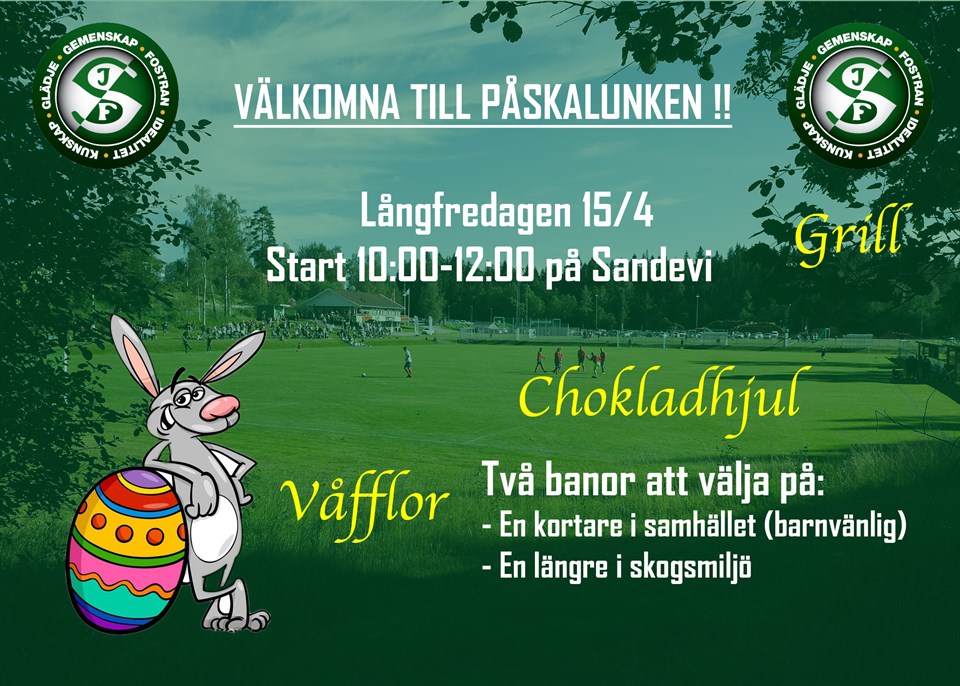 Som traditionen säger arrangerar Sandareds IF Påskalunken på långfredagen. I år välkomnar vi er alla upp till Sandevi den 15/4 där tipspromenaden har start mellan 10 och 12. På Sandevi kommer grillen vara tänd, våfflor att gräddas och chokladhjul att snurras. Välkomna att fira in påsken med oss! Sandareds IF 7 apr 2022 0kommentarer