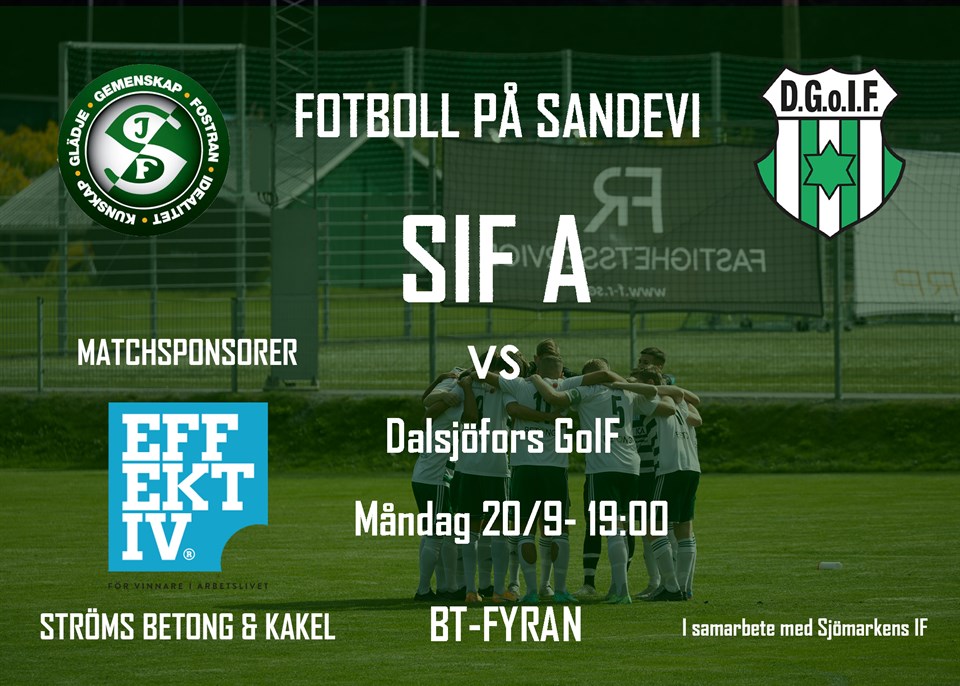 På måndag gästar Dalsjöfors GoIF Sandevi för match mot A-laget i Division 4. Det återstår endast tre matcher av serien och läget i tabellen för SIF är prekärt, efter två raka förluster. Seger och Sandared kan för en stund andas ut lite, förlust och laget dras in i en gastkramande bottenstrid av tabellen. Detsamma gäller Dalsjöfors, som ligger en poäng bakom SIF, på negativ kvalplats. Grabbarna behöver allt stöd de kan få för att reda ut stormen, så välkomna upp till Sandevi på måndag. Avspark 19:00!
