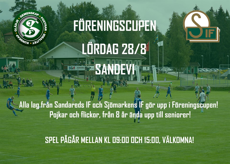 Imorgon, lördag, går Föreningscupen av stapeln på Sandevi. Det är en cup för alla lag i Sandareds IF och Sjömarkens IF, från 8 år upp till senior. Varmt välkomna upp, spel pågår mellan 09:00 och ca 15:00!