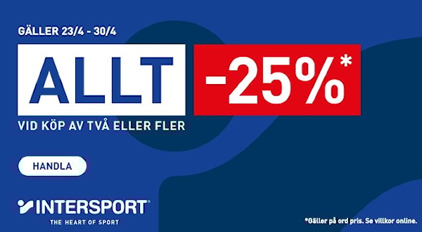 Mellan den 23/4 - 30/4 har vår samarbetspartner Intersport 25% rabatt på allt, för dig som handlar två varor eller fler, i butik eller på interport.se. Ett perfekt läge att köpa det ni behöver för vårens alla aktiva dagar.