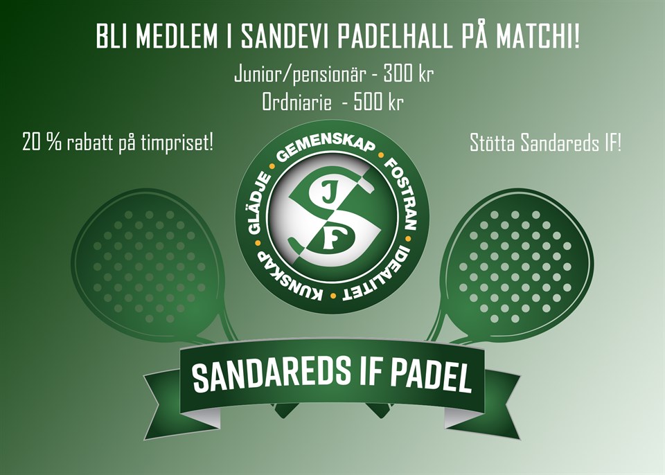 Ta chansen att bli medlem i Sandevi Padelhall på Matchi! För 500 kr (ordninarie) eller 300 kr (junior 6-17 år och pensionär 65+) har du nu chans att stötta Sandareds IF och samtidigt ge oss möjligheterna att förbättra vår verksamhet i Sandareds IF Padel!